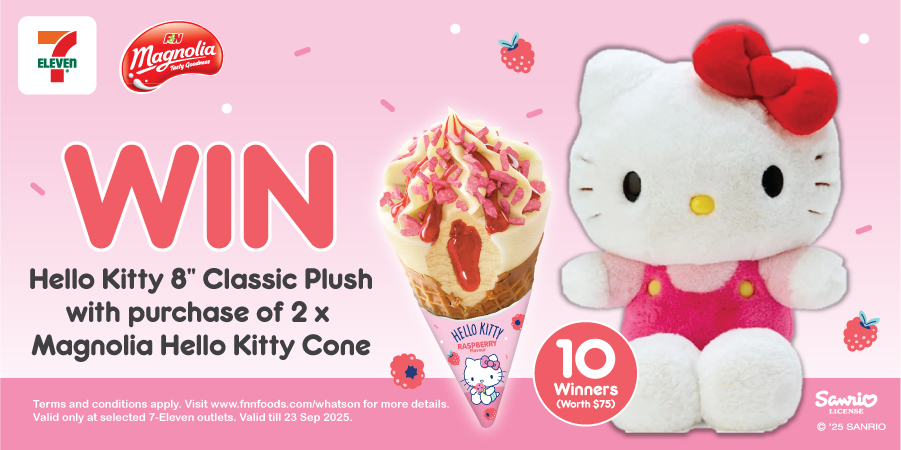 Purchase minimum 2 x Magnolia Hello Kitty Ice Cream Cone from participating 7-11 outlets and stand a chance to win Hello Kitty 8″ Classic Plush worth $75.00 each for total 10 winners!