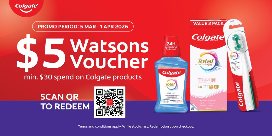 Purchase min. $30 worth of Colgate products in a single receipt and receive $5 Watsons e-voucher via email!